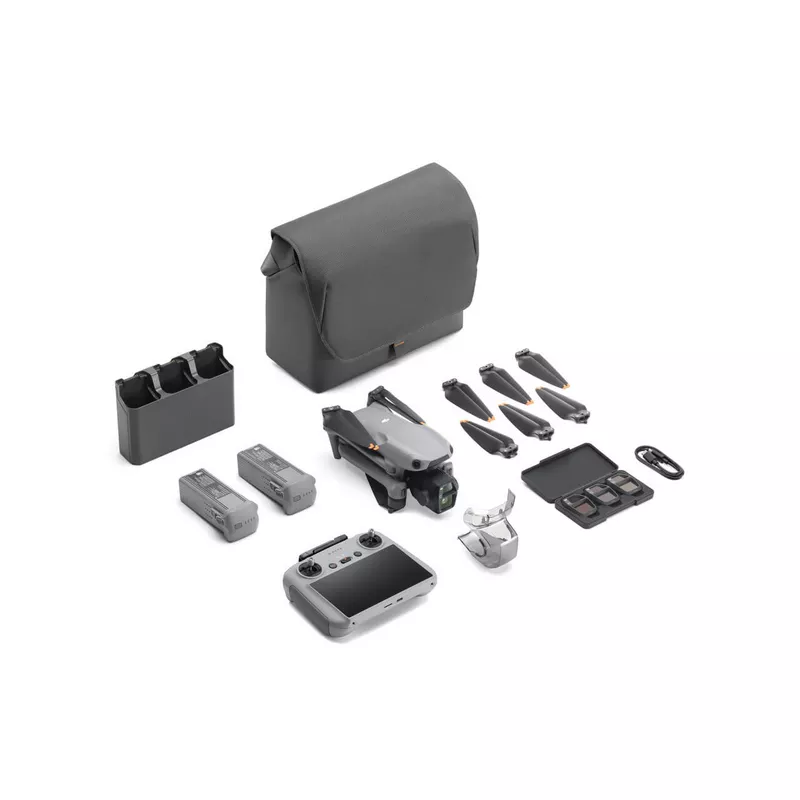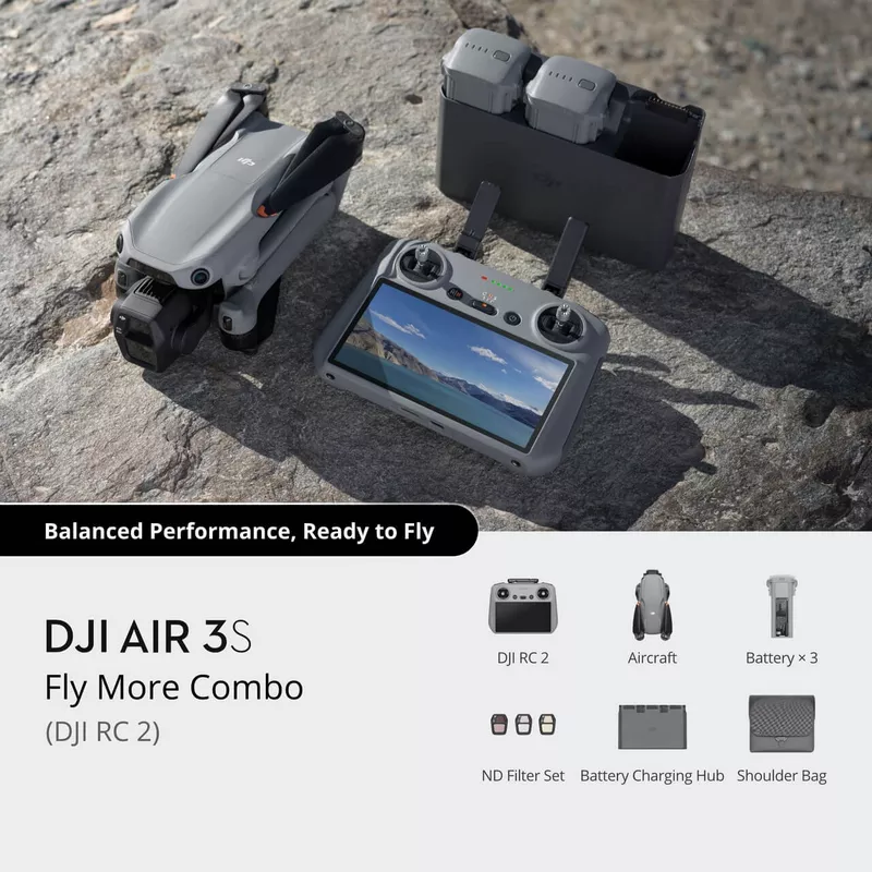 • DJI Air 3S Fly More Combo (DJI RC 2) Includes Air 3S, three intelligent flight batteries, one battery charging hub, an ND filter set, and a DJI RC 2 remote controller with a large and bright screen for an enhanced flight experience.