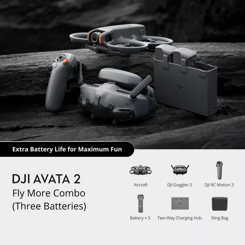 Compared to the DJI Avata 2 Fly More Combo (Single Battery), this extended combo additionally includes one Two-Way Charging Hub, two batteries, and one sling bag, offering a more comprehensive setup that eases your range anxiety and lets you explore more flight scenarios. DJI Avata 2 delivers an adrenaline pumping immersive FPV drone experience with improved imaging, safety, and battery life. Amp up the fun when you pair Avata 2 with the new DJI Goggles 3 and DJI RC Motion 3.