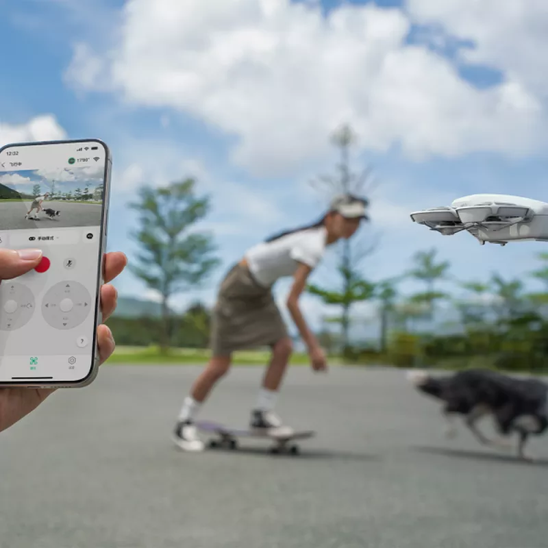 DJI Neo supports Wi-Fi connection to smartphones, eliminating the need for an additional remote controller. Control Neo using virtual joysticks on the DJI Fly app interface, with a control range of up to 50 meters. The app also allows you to set the tracking angle and distance, giving you the freedom to shoot from afar or up close as you please.