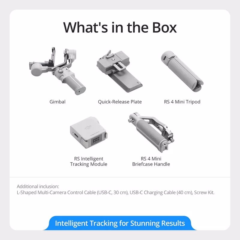 • Additionally includes the Tracking Module and Mini Briefcase Handle. The former provides intelligent tracking initiated by both gesture and trigger; the latter makes low-angle handheld filming more effortless.