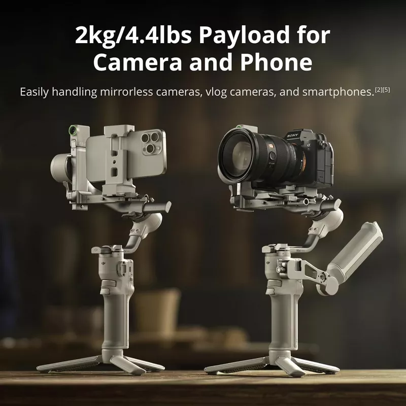 • Handles Cameras and Smartphones – The lightweight DJI RS 4 Mini Combo Gimbal Stabilizer supports up to 2kg/4.4lbs payload, able to handle mirrorless and vlog cams and phones, adapting seamlessly to your creative scenario.