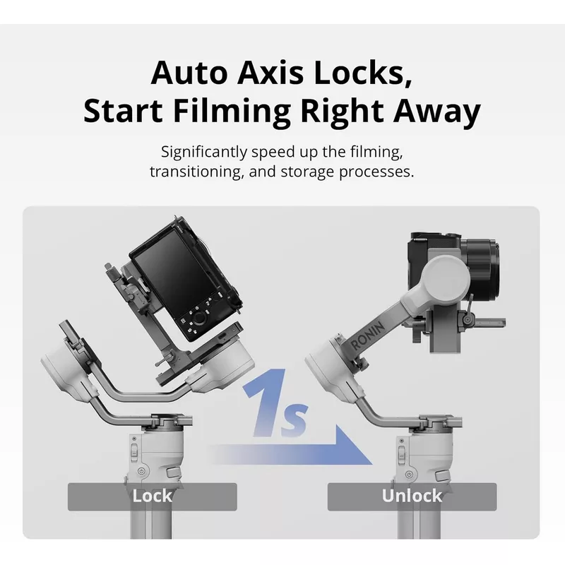 • Ready in 1 s – No more fumbling with manual locks The DJI RS 4 Mini Gimbal Stabilizer auto axis locks makes setup even faster. Perfect for capturing those fleeting moments or quick scene transitions.