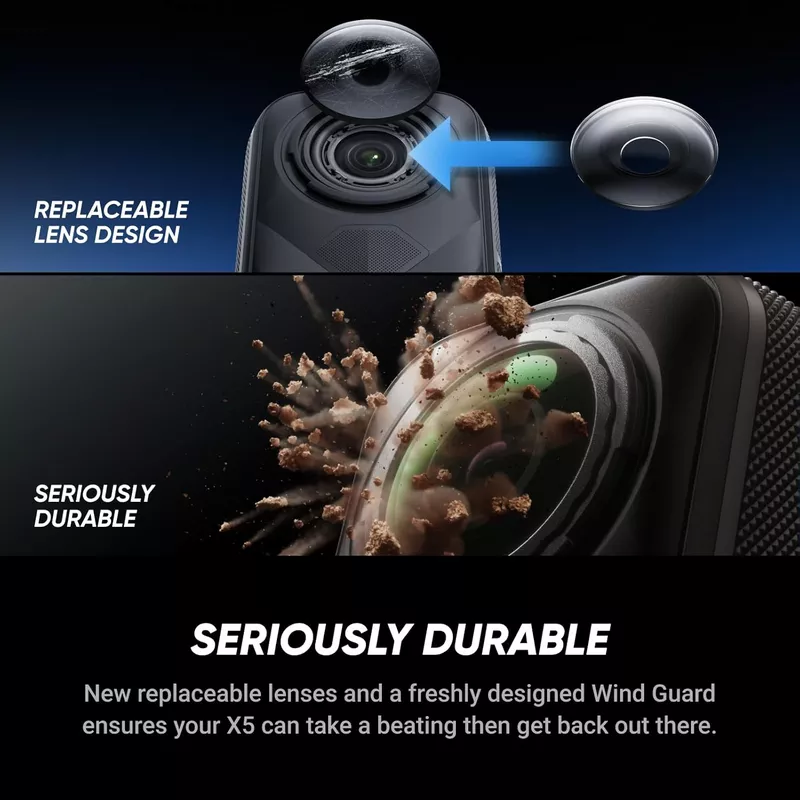 - Tougher, Replaceable Lenses: Brand new, fully replaceable lenses are here. Insta360 X5 Essentials Bundle upgraded lenses are tough, durable, and scratch-resistant. Easily replace them in seconds so you’re always ready to shoot your next mission.