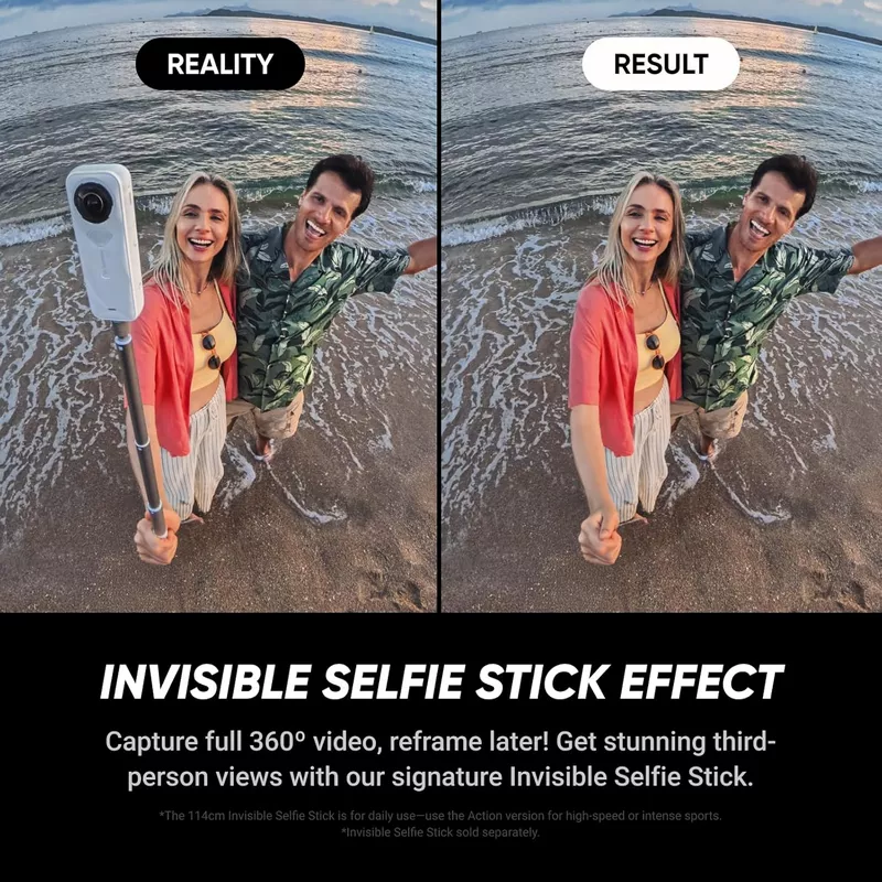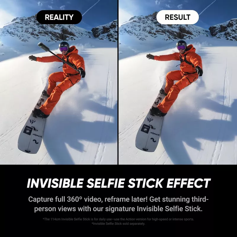 - Invisible Selfie Stick: Create impossible third-person views with no selfie stick in sight! Capture everything in 360°, then choose your angles later using AI-assisted reframing—perfect shots, every time. *Invisible Selfie Stick sold separately.