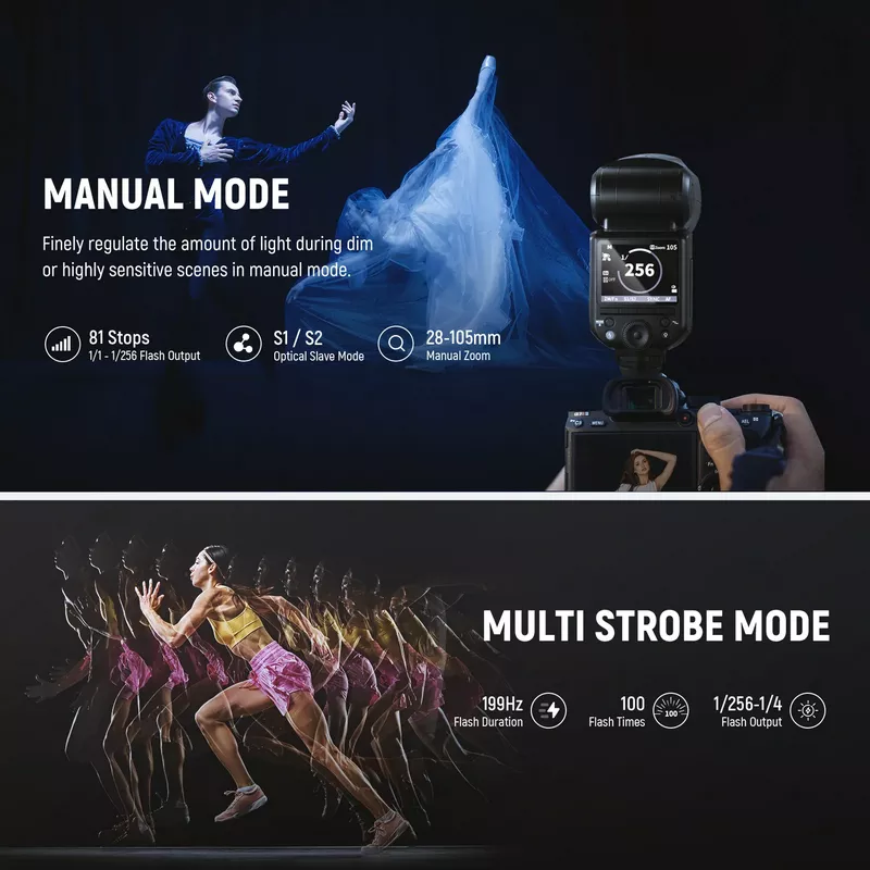 - Enhanced UI and TTL/M Mode Switch– This speedlight has an upgraded UI and a TCM key that switches from TTL to M mode in a second. It features automatic metering, 1/1-1/256 manual dimming, 28-105mm focal length, stroboscopic flashes, 1/8000s HSS, front/rear curtain sync, FEC/FEB/FEL (flash exposure compensation/bracketing/locking), S1/S2 optical slave modes, and other functions