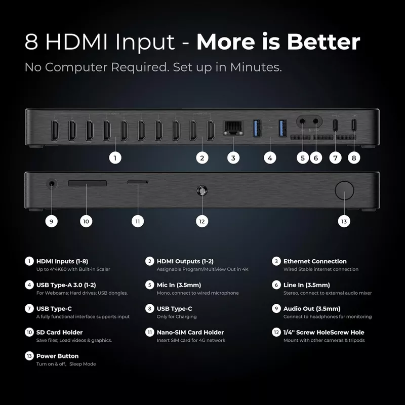 - 8 HDMI Inputs with 2 Assignable Outputs: With YOLOLIV YoloBox Extreme Connect up to 8 HDMI sources with built-in 4K60 scaling for a seamless multi-camera setup. Assign your outputs (Program, Multiview, or Preview) independently via 2 HDMI outputs in stunning 4K