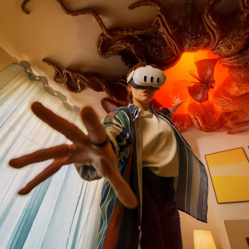 The dual RGB cameras combine with a depth projector to deliver 10 times the pixels of Meta Quest 2’s passthrough feature, and in full color with high fidelity. With various applications, you can insert virtual objects and experiences into the real world. Play a virtual board game on your real coffee table. Create a large floating screen to watch videos, get work done, or game with Xbox Cloud Gaming support. You can even use augments to create persistent virtual objects that will stay and reappear when you next put on the Meta Quest 3. Persistent virtual objects can include floating picture frames and videos, portals to sweeping vistas, or virtual experiences.