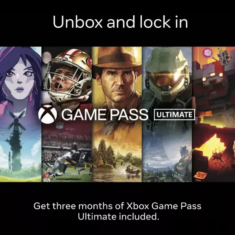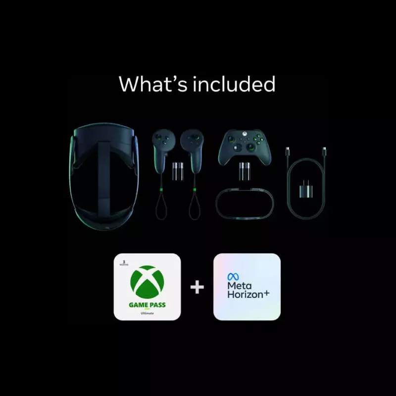 Limited-edition Meta Quest 3S Xbox Edition (128GB), Meta Quest Elite Strap (pre-installed), Standard Facial Interface (pre-installed), Glasses Spacer, Limited-edition Xbox Controller (AA batteries included), Limited-edition Meta Quest Touch Plus Controllers (wrist straps and 2 AA batteries included), Power adaptor, Charging cable, 3 months of Xbox Game Pass Ultimate included.