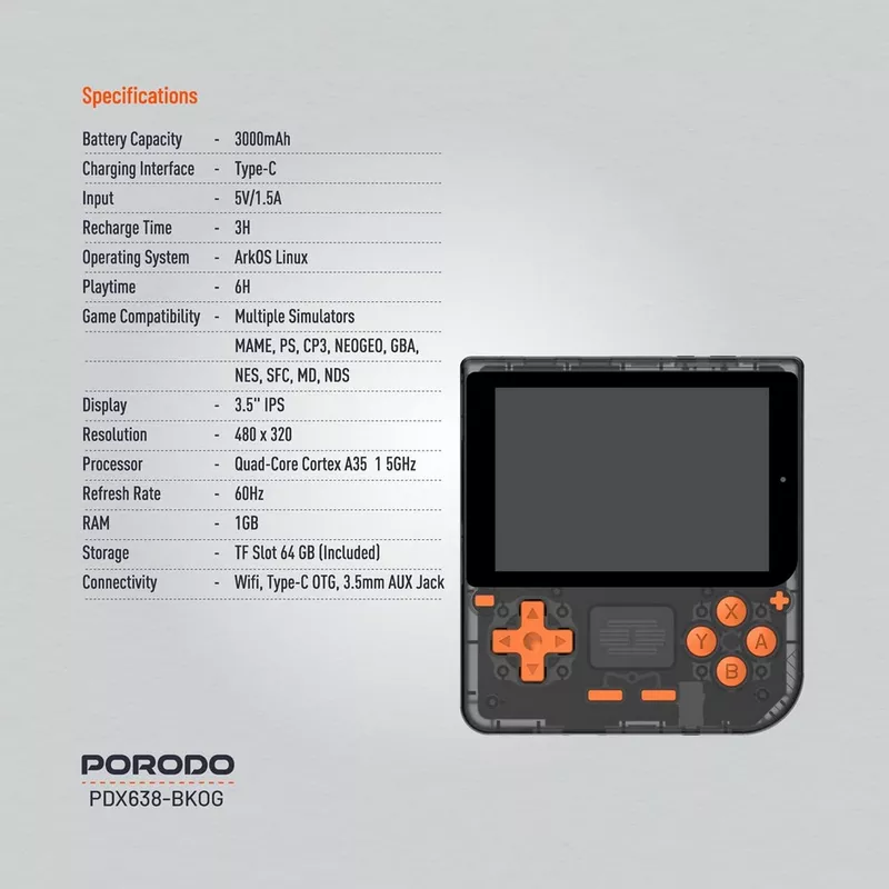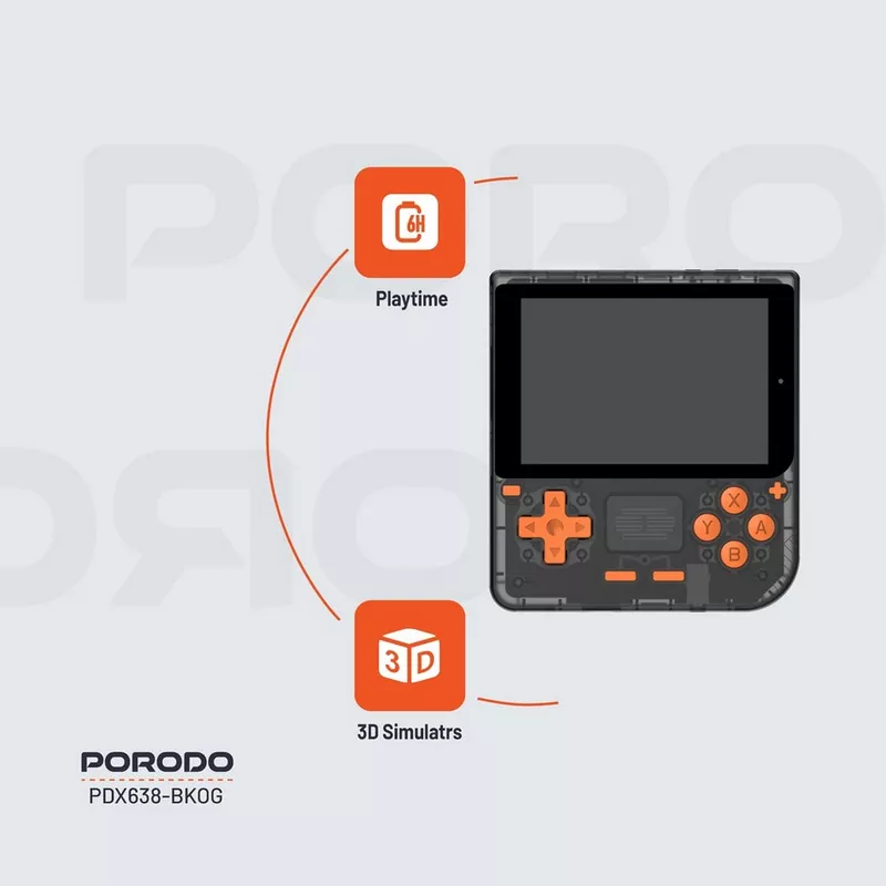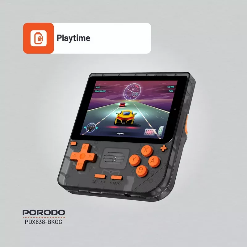 Venture back into the history of video games with the Porodo Gaming Retro Arcade Gaming Console. It is planned and created with comfort for classic players and first-time audiences. This powerful console uses a robust 3000mAh battery, enabling up to 6 hours of play without interruption. It features 1GB RAM, so there is no lag, even with the number of games being played reaching over 5000.
