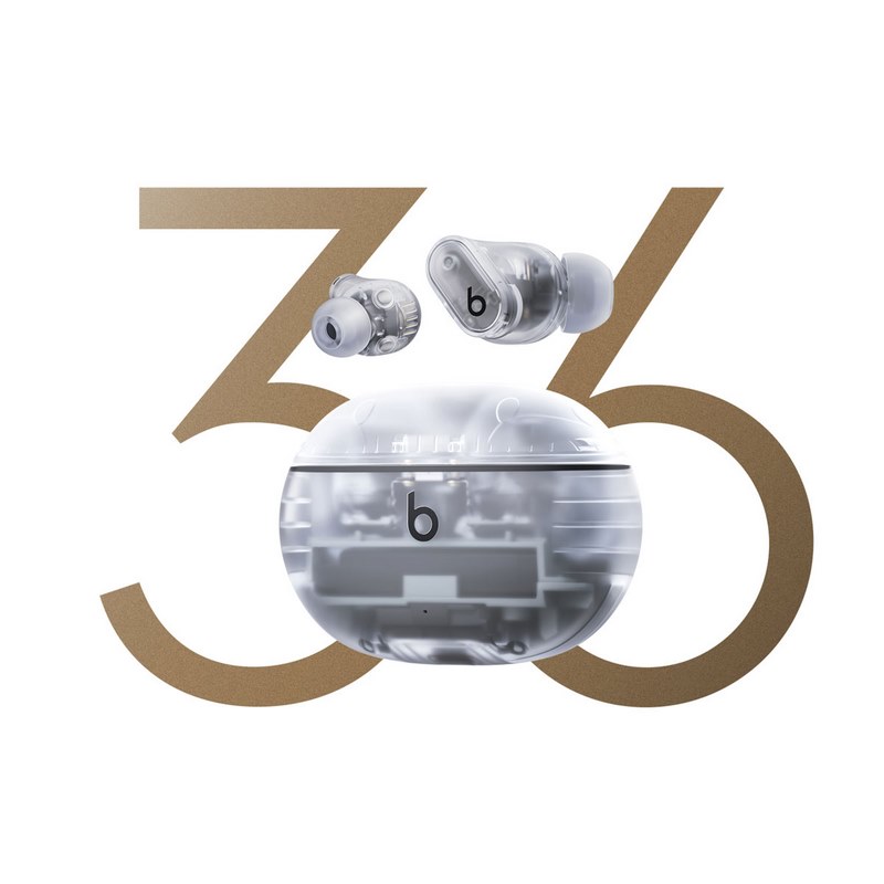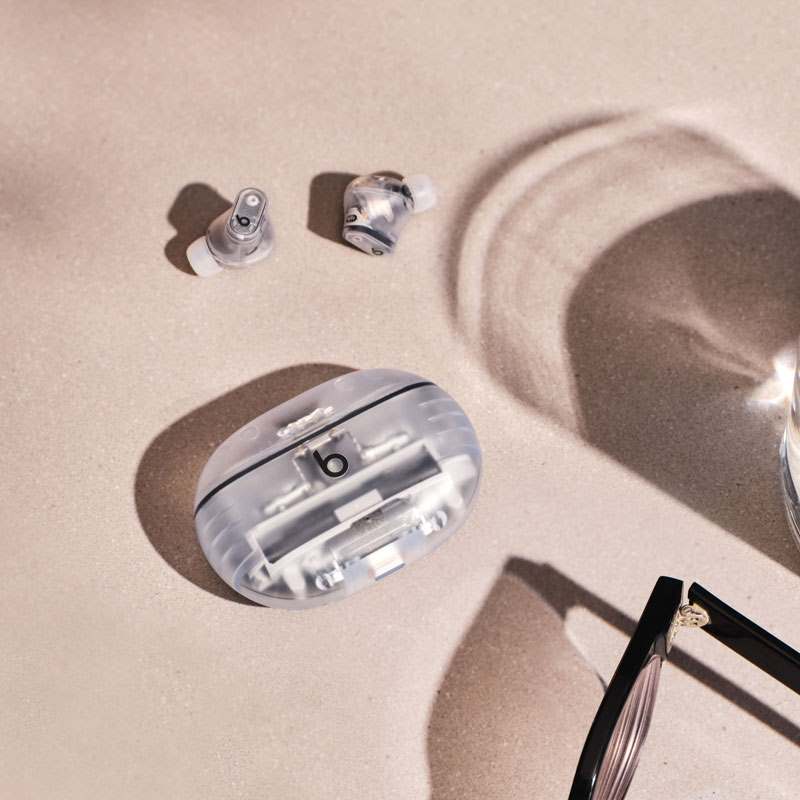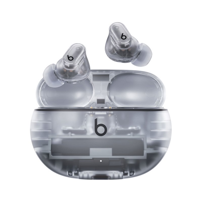 Beats Studio Buds + case, earbuds, ear-tips, and cord in Transparent.