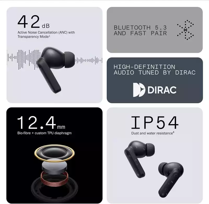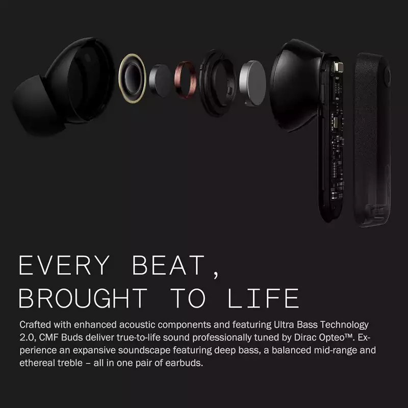• Clear Highs, Powerfully Pure Bass — CMF Buds bluetooth headphones oversized 12.4mm Bio-fiber drivers and Ultra Bass Technology 2.0, delivering boosted bass for everyone. We jointly tuned five popular EQ settings with Dirac to ensure an optimal sonic experience adapted to various music styles.