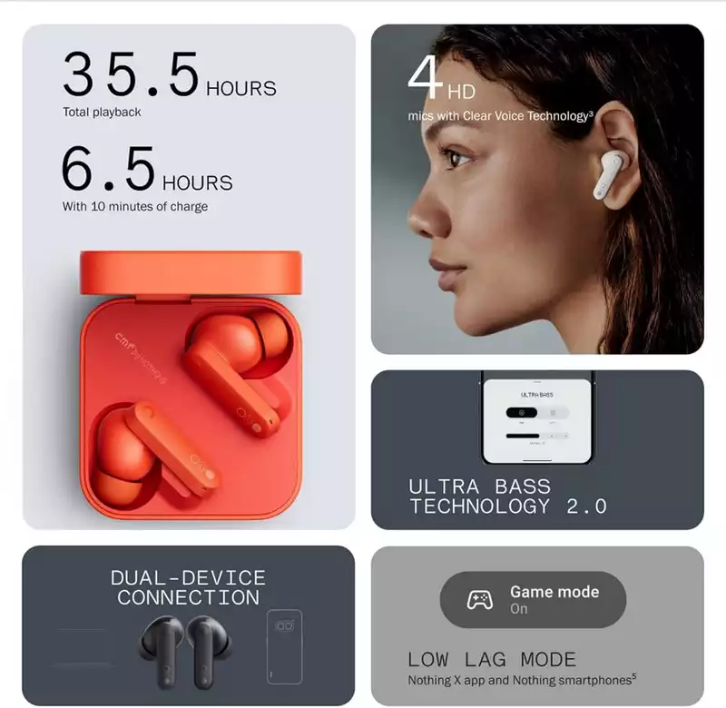• Long Playtime, Fast Charging — Get 8 hours of battery life on a single charge with a case that extends it to 35.5 hours. If CMF Buds wireless earbuds are low on power, speed charge for just 10mins to get 6.5H of playtime.