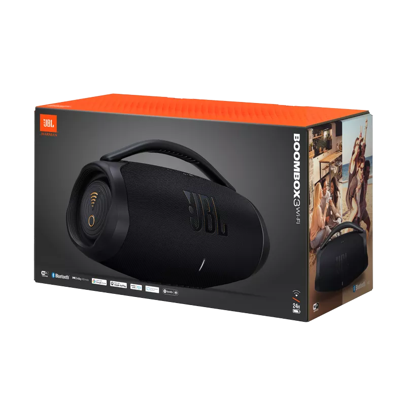 The JBL Boombox 3 Wi-Fi and Bluetooth speaker delivers massive JBL Original Pro Sound with the deepest bass from a portable speaker. Stream high definition music anywhere with the JBL Boombox 3, including 3D Dolby Atmos over Wi-Fi. Taking a call or scrolling your feed? Go ahead—it won’t interrupt your music. Switch easily to Bluetooth and keep enjoying seamless audio experiences whether you’re indoors or outside. With a battery packing 24 hours of playtime and the waterproof and dustproof design, you’re always ready for all-day adventures. Stream music through AirPlay, Alexa Multi-Room Music, Chromecast built-in™ and Spotify Connect. Enjoy all of your favorite audio content, Internet radio, and podcasts in high definition. And wherever you go, the eco-friendly materials—incorporating recycled fabric and plastic—will help to make the world a little greener.