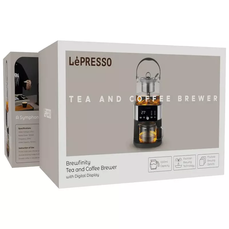 The LePresso Brewfinity Tea and Coffee Brewer with Digital Display is a top-notch device that turns the daily coffee-making exercise into a seamless, fast, and pleasurable experience. With a 1000ml kettle, you will have no problem making a large number of coffee or tea cups at the same time, so it is suitable for home or office use. Using the Fountain Brewing Technology, the water is uniformly distributed over the coffee or tea grounds, thus every time it is possible to get a rich and balanced taste. Brewfinity provides several different brewing styles, and you can set the strength and flavor of your drink to match your liking.