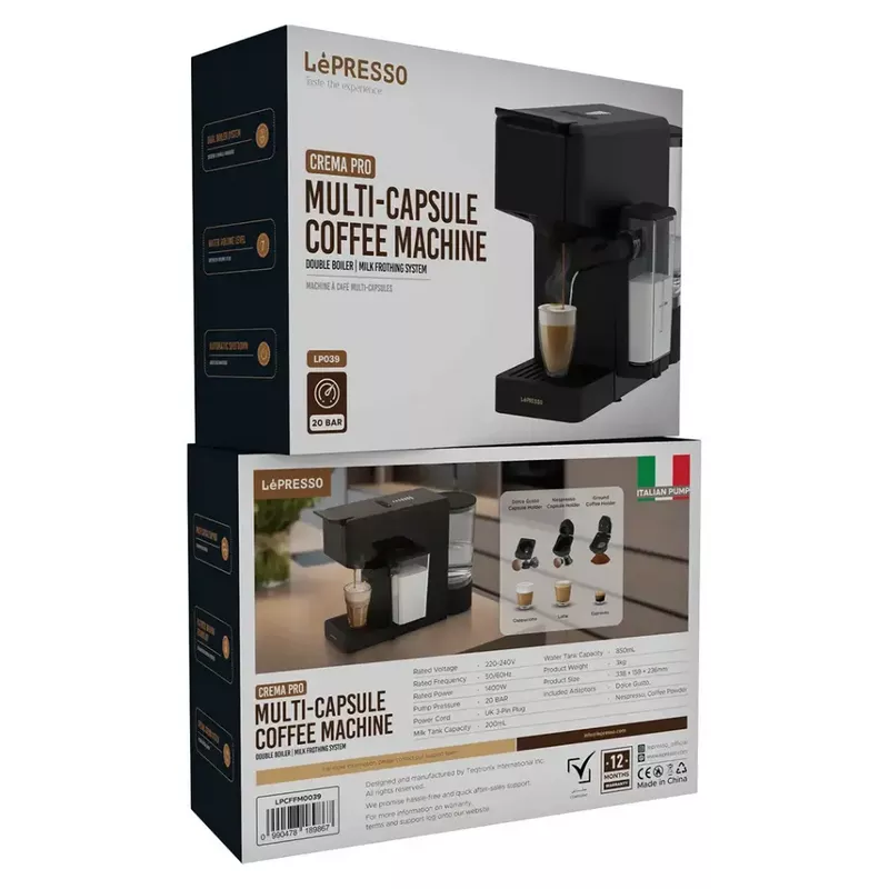 Make your barista-quality coffee home with the Lepresso Crema Pro Multi-Capsule Coffee Machine. With a power rating of 1400W and voltage of 220-240V, it brings out rich 20 BAR pump pressure to extract deep flavors from every capsule. With a dual boiler system, this machine ensures temperature regulation for the perfect brew every single time. The big 850mL water tank and 200mL milk tank offer convenience for multiple cups and luscious froths. Thanks to the adaptors, it can hold several capsules, including Dolce Gusto, Nespresso, and coffee powder, making it a multi-beverage drinker for coffee lovers.