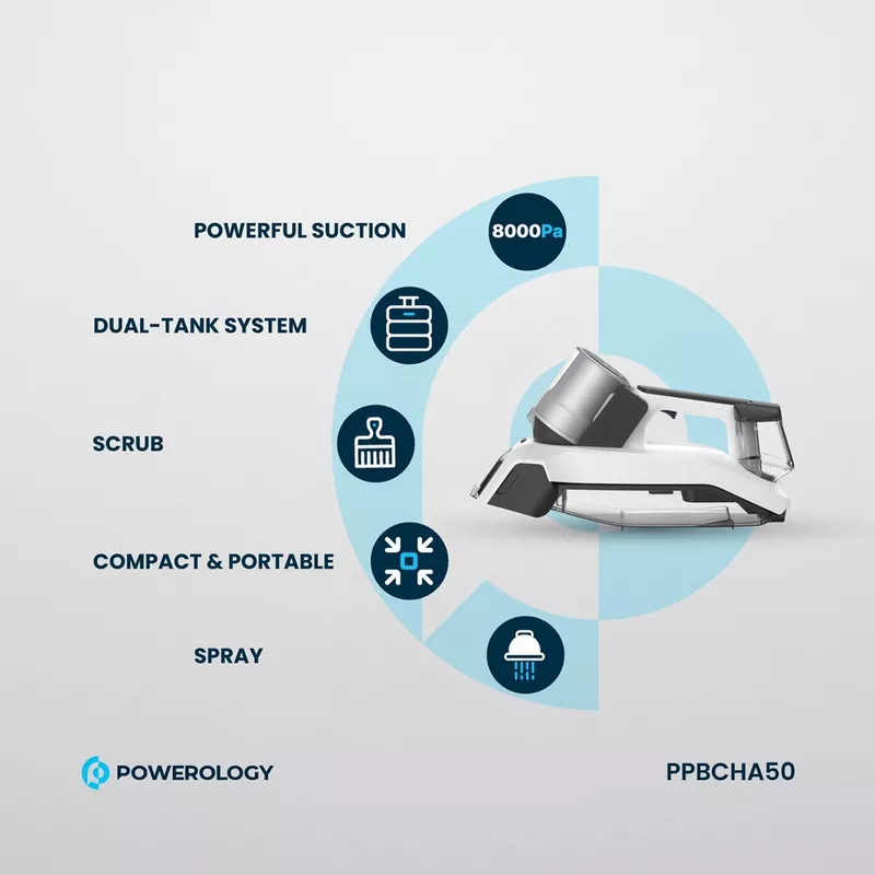The Powerology Cordless Spot Cleaner is a new, versatile, and convenient machine for those looking for an easy way to clean their homes after dirt. The 2000mAh, 11.1V battery lets the cleaner perform at an imposing suction of 8000Pa, making sure no speck of dirt remains in its wake. Its performance efficiency is rated at 60W. With a Type-C charging port, this vacuum takes only 3 hours to recharge and can give up to 20 minutes of continuous cleaning. This product has a 300ml clean tank and a 500ml dirty tank. The Digital Battery Display informs you about the battery’s state to recharge the device. Its handheld and portable design makes it easy to maneuver around, ensuring that you can get into those tricky spots. Upgrade your cleaning with the Powerology Cordless Spot Cleaner, where convenience meets raw power—the ultimate addition to round out the family. With its cordless design, you can enjoy a genuinely freeing, clean, and confident tackle to messes!