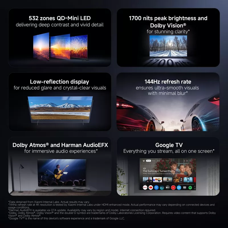 Xiaomi TV S Pro Mini LED 65 2026 - Banner - Xiaomi Kuwait - Alezay KuwaitXiaomi TV S Mini LED 75Advanced Mini LED zoning1700nits peak brightnessLow reflection displayLower reflectivity, Higher contrasteye-protecting displayVivid color engineGlobal dimming engineDeep contrast engineDolby Vision and Dolby AtmosHarman AudioEFX tuningXiaomi Sound288Hz ultra-high refresh rate modeDynamic clarity engineGoogle TVHey GoogleXiaomi TV+Apple AirPlay360° Bluetooth remote controlLuxury designTwo mounting options