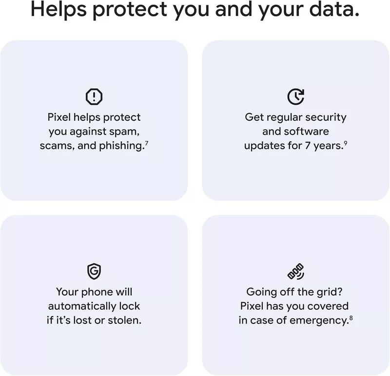 • Multi-layer hardware security: Tensor security core, certified Titan M2 security chip and Trusty (Trusted Execution Environment)