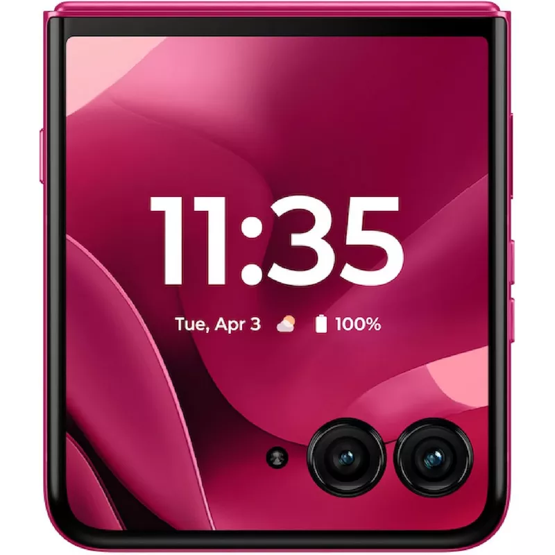 In Motorola Razr 60 Ultra PANTONE Cabaret  make your external display yours by customizing the Home screen with animated characters, photos, and templates, setting the perfect call background, or choosing a Moto clock style that matches your vibe.