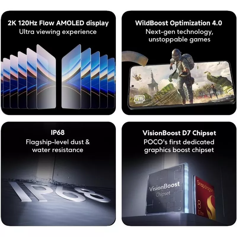 Flagship Snapdragon® 8 Elite | VisionBoost D7 Chipset | 120W wired and 50W wireless HyperCharge | 2K 120Hz Flow AMOLED display | 50MP Triple camera with OIS | IP68 dust and water resistance
