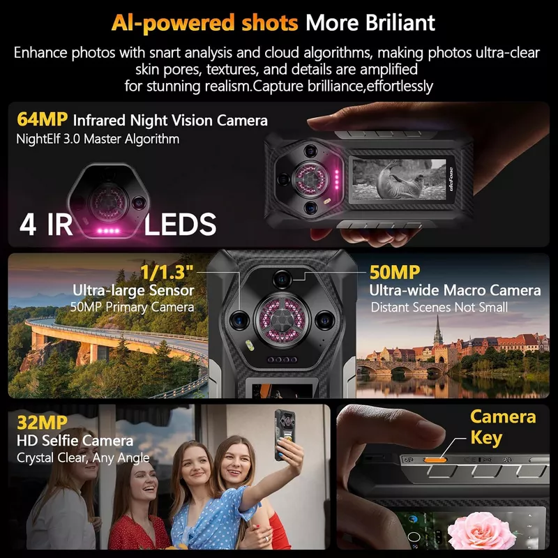 • Rear Camera: 50MP  wide Camera + 64MP night vision camera + 50MP ultra-wide camera, Dual-LED flash