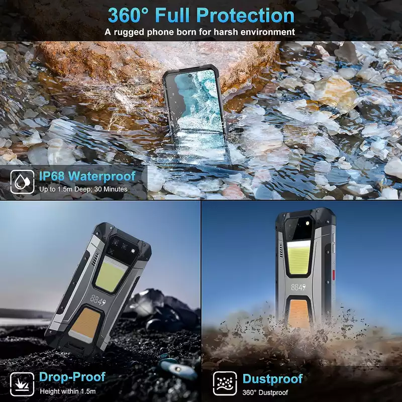 ✔This android 13 Unihertz 8849 Tank 2 rugged smartphone with 360°full protection, which makes this rugged phone is not only waterproof, also shockproof(Height within 1.5m/4.92ft) and dust-proof. Its waterproof design can be used continuously for up to 30 minutes in water at a depth of 1.5 meters, so you can take photos and videos underwater