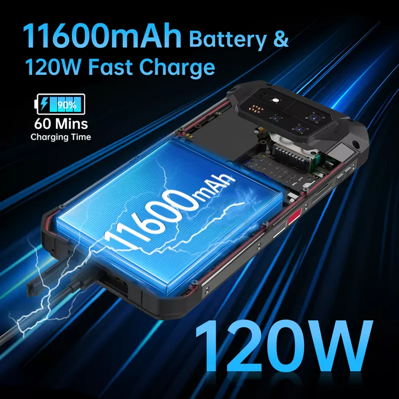 The 11600mAh battery far exceeds typical phone capacities (4000-6000mAh), catering to heavy users, travelers, outdoor enthusiasts, and mobile professionals. 120W fast charging rapidly replenishes the battery, ensuring minimal downtime.